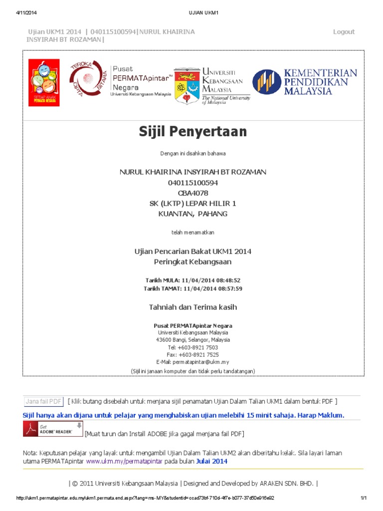 Universiti Kebangsaan Malaysia tidak bertanggungjawab atas sebarang kerosakan atau kesalahan maklumat yang mungkin terjadi dari kandungan yang telah dialih bahasa. Ujian ini merupakan saringan pertama untuk mencari murid pintar dan berbakat bagi menyertai program program berikut. Ujian dalam talian ini adalah percuma dan boleh diambil.
